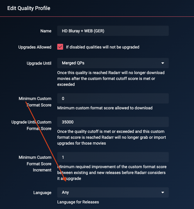 We choose Any for the language profile, as otherwise, English movies identified with German audio and vice-versa will not be grabbed.
