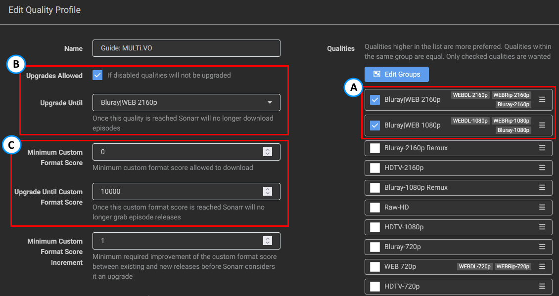 ⚠ Careful to not add the VOSTFR Custom Format with a score of -10000 as stated in the original guide. Otherwise, you will hinder your chance to get "French" releases.