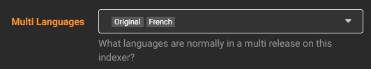 In Sonarr, you can tell that MULTi in an indexer means that a release possesses at least certain audio. For the purpose of this guide, you will select Original and French. This option should only be used for French indexers. Doing so in more "international" indexers can create false positives with the French Audio CFs.